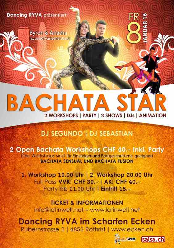 En este año, queremos dar mas a nuestro Publico, Profesionales Instructores, Profesionales Shows, Musica en Vivo con los mejores Grupos Nacionales y Grupos Internacionales, eso y mas, te invitamos a nuestra primer Evento del 2016, ese Viernes 8. de Enero 2016 "BYRON & ARIADNI BACHATA STAR" directamente desde Grecia! no deje que te lo cuenten, sé parte de la historia :)
