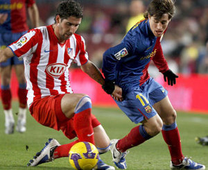 El jugador del FC Barcelona Bojan pelea un balón con Raúl García, del Atlético de Madrid, durante el partido de vuelta de los octavos de final de la Copa del Rey.