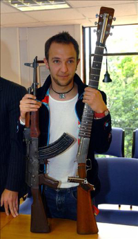La banda colombiana Alma Parlantes, encabezada por el creador de la "escopetarra" César López, presentó su simbólico instrumento ante decenas de miembros de las Naciones Unidas en un concierto a beneficio de la campaña Armas Bajo Control.