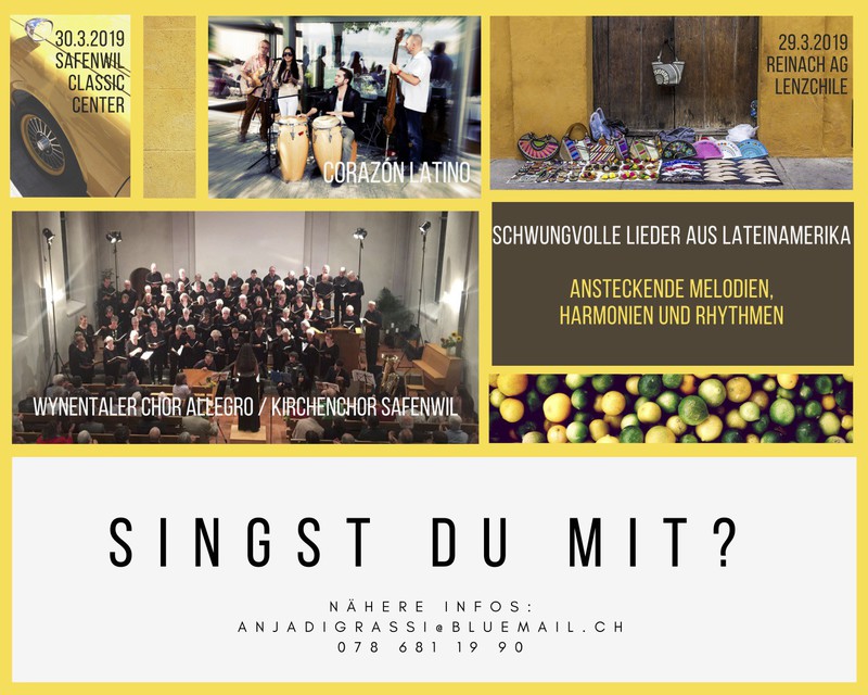 Für das nächste gemeinsame Projekt sucht der Kirchenchor Safenwil und der Wynentaler Chor Allegro Leute, die gerne mitsingen möchten. Mitmachen ist für alle möglich! Beide Chöre beginnen mit den Proben nach den Sommerferien 18, zuerst alleine, d.h. am Mittwochabend in Leimbach ODER am Donnerstagabend in Safenwil. Erst die letzten 5 Proben werden dann gemeinsam sein. Nähere Infos bei der Dirigentin Anja Di Grassi
