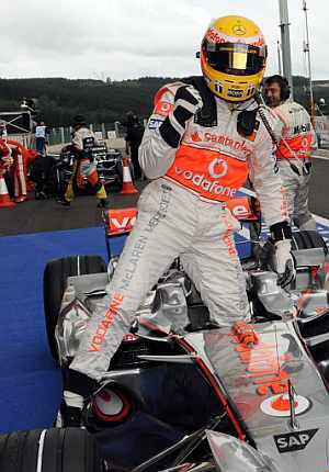 Lewis Hamilton, líder del Mundial, partirá el primero en el GP de Bélgica tras conseguir la 'pole position' por delante de Felipe Massa y de su compañero Heikki Kovalainen.