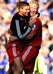 El Liverpool consiguió una victoria agónica tras anotar un penal en el tiempo de descuento ante el Everton (1-2) en uno de los derbis más vibrantes de los últimos años, y sale indemne de un partido que se le había puesto en contra tras el gol en propia meta de Sammy Hyypia.
